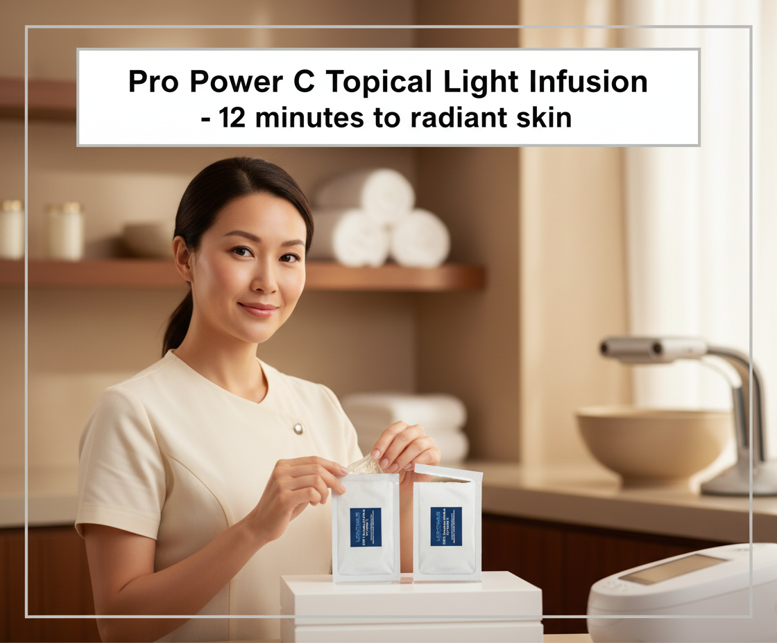 Improve your client’s natural glow with our new Pro Power C Topical Light Infusion Treatment for use with your Lightwave LED system. This concentrated 12-minute Red Light Infusion treatment utilizes powerful, proven ingredients to target fine lines, wrinkles, pigmentation and uneven skin tone and texture. Highly concentrated Power Pure™ Vitamin C Spheres are blended with Hyaluronic Acid, Sepitonic™ M3 Active Mineral Complex and Glutathione for a dose of triple-action, age fighting super-stars. This new TLI will ship with a USB update to add the new TLI programming to your LIGHTWAVE system.