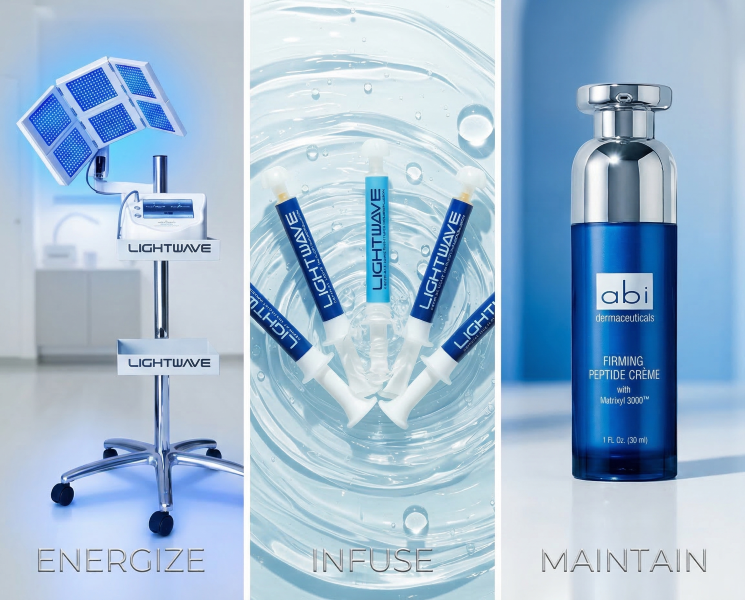 This is the foundation of the Lightwave Methodology, which combines Lightwave red light therapy and Topical Light Infusion (TLI) with targeted ABI Dermaceuticals homecare to deliver consistent, long-term results.